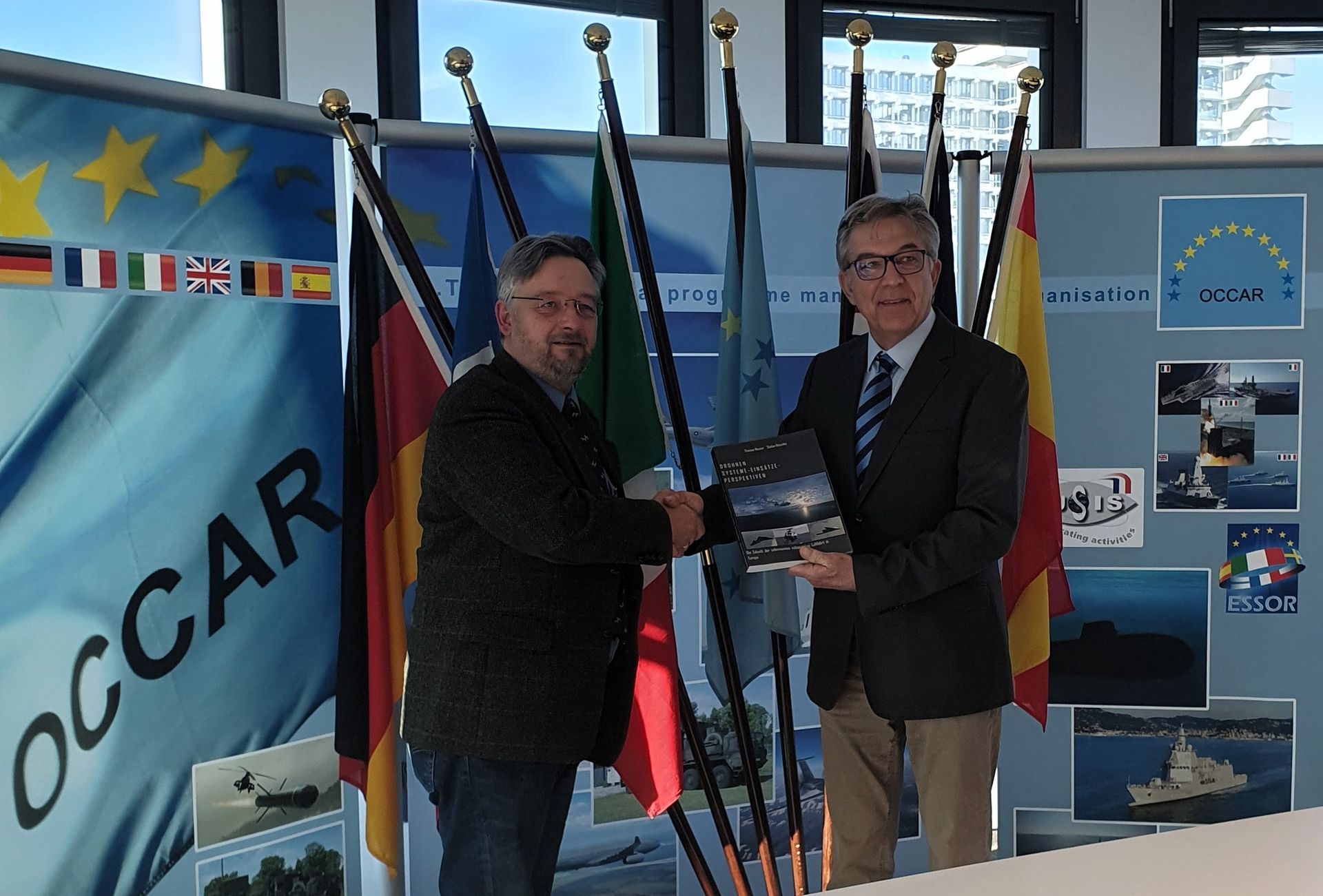 Der OCCAR-ER Direktor Joachim Sucker erhielt aus den Händen des Verlegers und Chefredakteurs von MD&Partner, Thomas Meuter die neuste Fachpublikation des Verlags mit dem Titel: Drohnen - Systeme - Einsätze - Perspektiven: Die Zukunft der unbemannten militärischen Luftfahrt in Europa. Der Direktor der europäischen Rüstungsbehörde hatte ein Grußwort für diese Fachpublikation geschrieben, die auf das wichtige Rüstungsprogramm einer MALE-Drohne eingeht. Darüber hinaus wurde ein Fachbeitrag über dieses zukunftweisende und leistungsfähige Programm zusammen mit der OCCAR-ER-Pressestelle erarbeitet und in dem Buch veröffentlicht, die die europäischen Aspekte dieses Programms als auch technischen Leistungsparameter veröffentlicht. Die OCCAR-ER trug maßgeblich dazu bei, europäische Aspekte in dieser Fachpublikation in Sachen Drohnenentwicklung deutlich werden zulassen, die keinesfalls in derartig komplexen Programmen unterschlagen werden dürfen. Bei der Buchübergabe sprach der Direktor Sucker von einem einzigartigen und sehr komplexen Fachbuch, welches schon heute ein fachliches und unverzichtbares Standardwerk auf diesem Gebiet darstellen dürfte. Drohnentechnologien sind heute derartig komplex, dass diese auf europäischer Ebene umgesetzt werden müssen, um entsprechende Technologien den Streitkräften zur Verfügung zu stellen. Sucker verwies mit Stolz auf die Tatsache, dass sogar Japan sich massiv für die europäische Drohne interessiere und hier einen Beobachtungsstatus erlangte, was derzeit einzigartig ist.